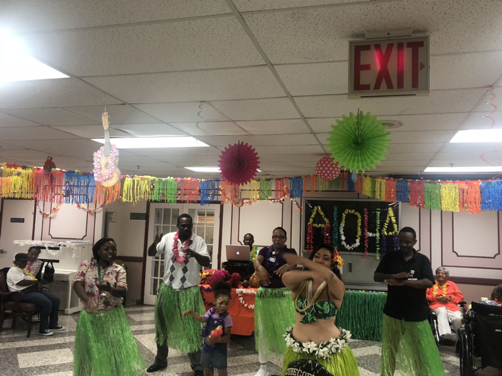 On Wednesday, August 29th, Four Seasons Nursing and Rehabilitation Center, 1555 Rockaway Parkway, hosted their Annual End of Summer Hawaiian Luau Party for residents and families. This year, the event had to be held indoors due to extreme heat. Many wore leis around their necks, flowers in their hair or grass skirts to match the decorations inside the party room, giving off a tropical island vibe. Everyone enjoyed the evening, watching a Hawaiian dancer and listening to music from DJ Derrick. The dancer also taught anyone interested in learning native dance moves. Other activities included face painting and balloon creations. Snacks and beverages were supplied by the Food Service Department, and everyone enjoyed the added treat of ices. Special thanks go out to Four Seasons staff members, who assisted with serving the food, encouraging residents to dance and making it an enjoyable evening for all. The Hawaiian Luau Party was coordinated by the Therapeutic Recreation Department.