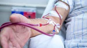The patient is connected to a machine that draws blood and passes it through the dialyzer. The dialyzer then cleans the blood, removing the toxins. As a result, the blood is very clean and not as watery.